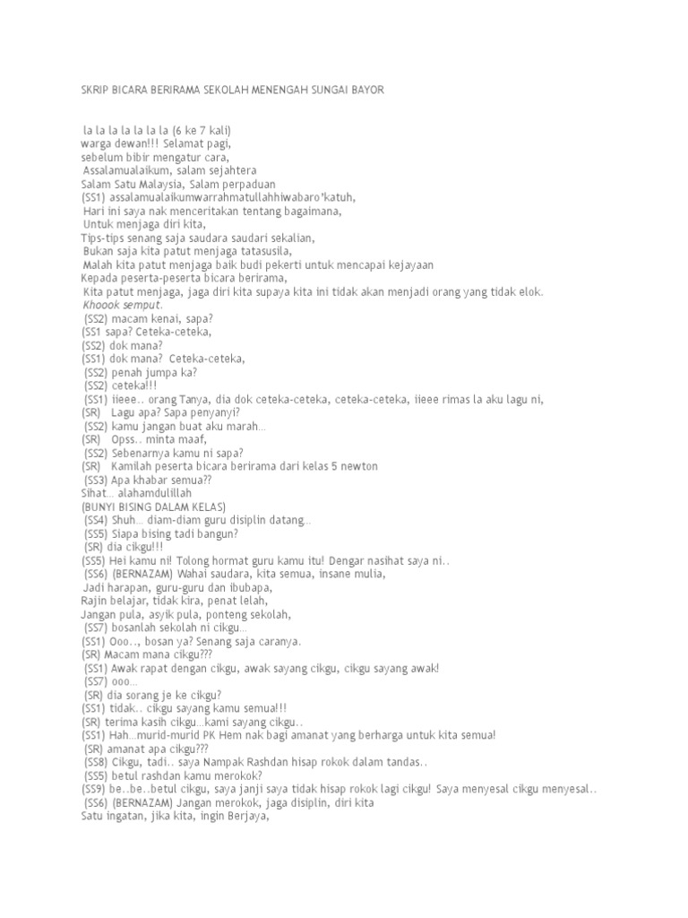 SKRIP BICARA BERIRAMA SEKOLAH MENENGAH SUNGAI BAYOR. Arahan dalam skrip dinyatakan dengan jelas dan difahami 138 KEMENTERIAN PELAJARAN MALAYSIA BICARA BERIRAMA SEKOLAH MENENGAH KERTAS KONSEP 594 Watak 10 markah Mempunyai watak SUARA SOLO dan. SELAMAT PAGI TUAN PUAN WARGA DEWAN 2.